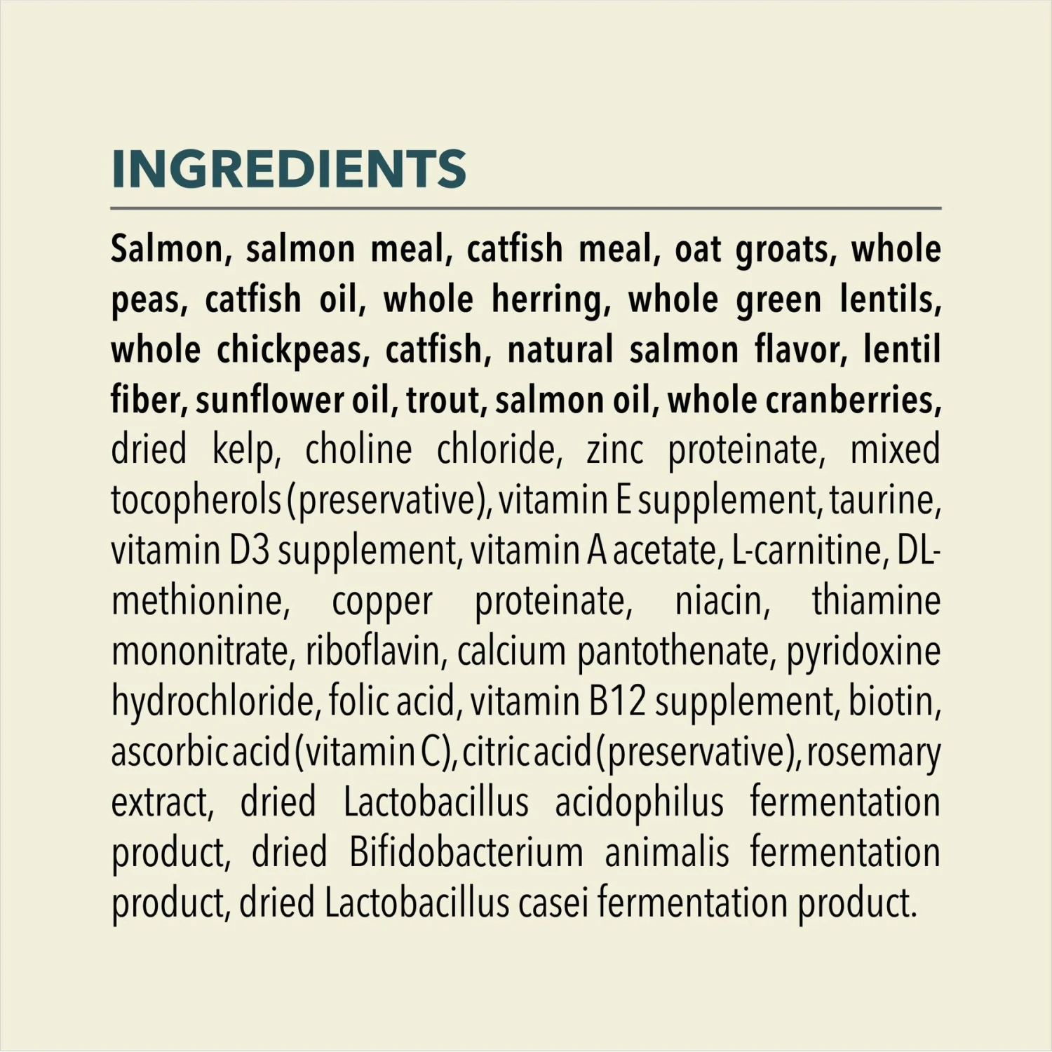 - This high-protein cat food starts with wild-caught whole herring and responsibly farmed salmon, catfish and trout.