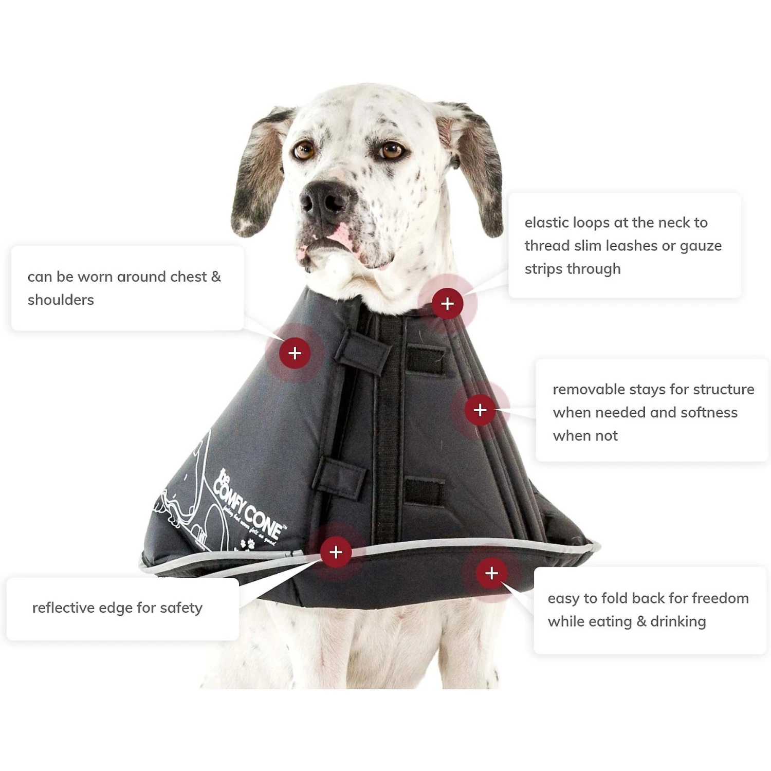 - Three fuzzy fastener strips help achieve the ideal cone shape and fit; includes a reflective edge for added safety and elastic loops at the neck to thread your pet’s collar through for a secure fit at the neck.