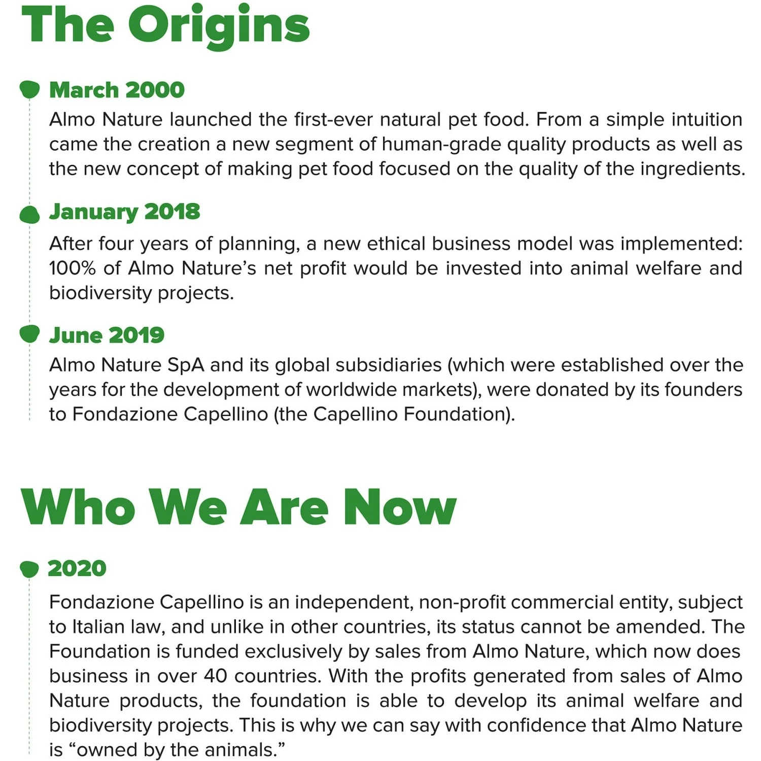 - 100% of the profits from Almo Nature product sales (after expenses and taxes) go toward Amo Nature’s mission to protect biodiversity and fight against climate change.