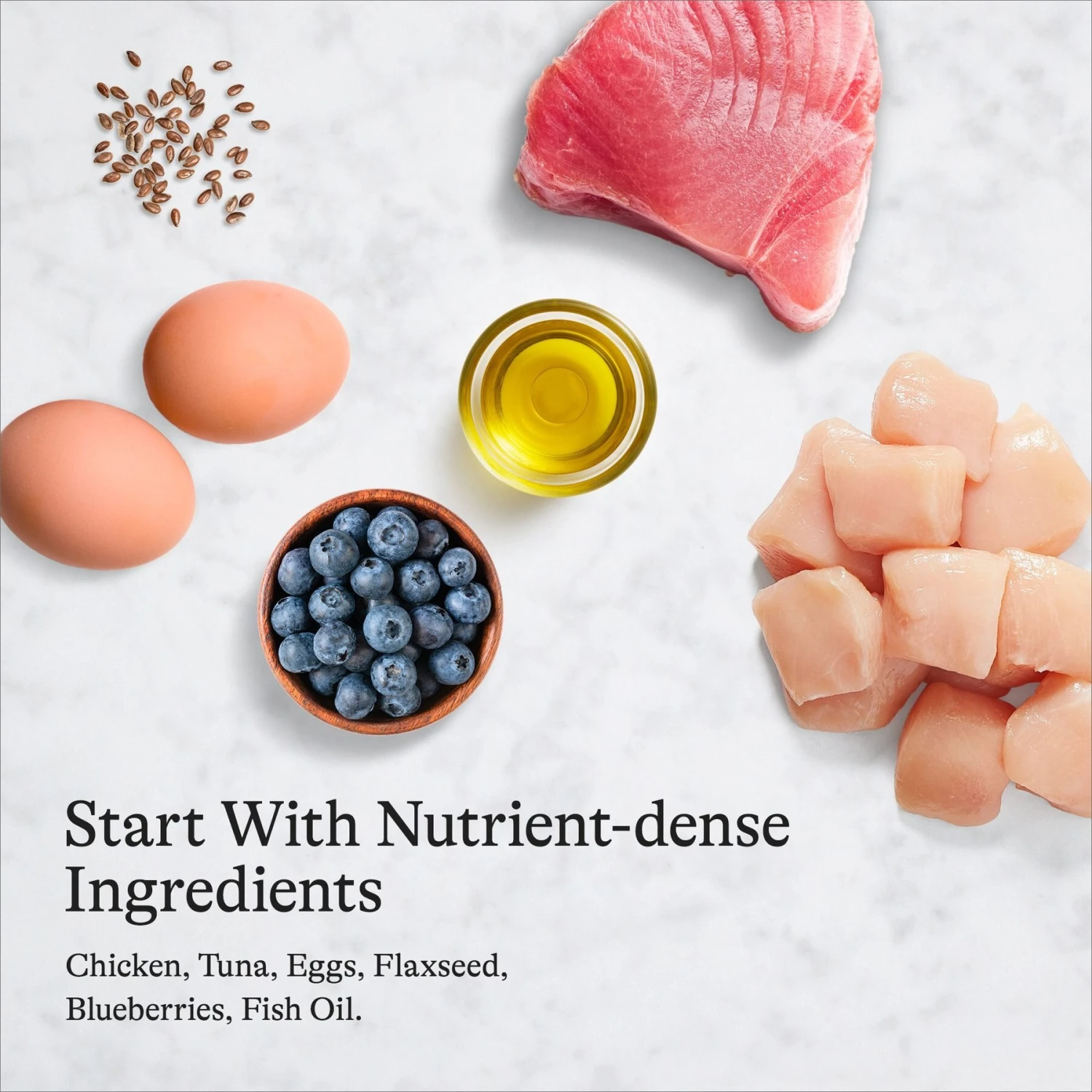 - 100% grain-free adult recipe is made with chicken and tuna bits as the top ingredients for the protein needed to support lean muscles.