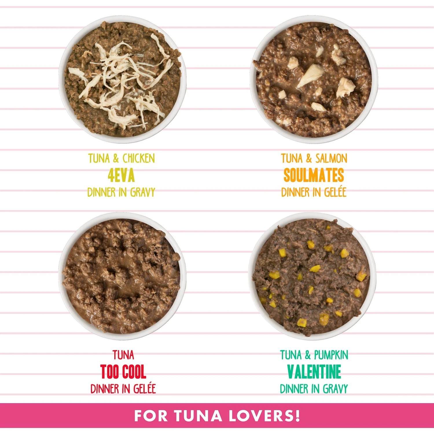 | Flavor | Tuna & Shrimp Sweethearts in Gravy, Tuna & Chicken 4-Eva in Gravy, Tuna Too Cool in Gelee, Variety Pack, Tuna & Tilapia Twosome in Gelee, Tuna & Pumpkin Valentine in Gravy, Variety Pack: Big Feline Feast, Tuna & Chicken Chuckles in Gelee, Tuna & Salmon Soulmates in Gelee, Tuna & Bonito Be Mine in Gelee |