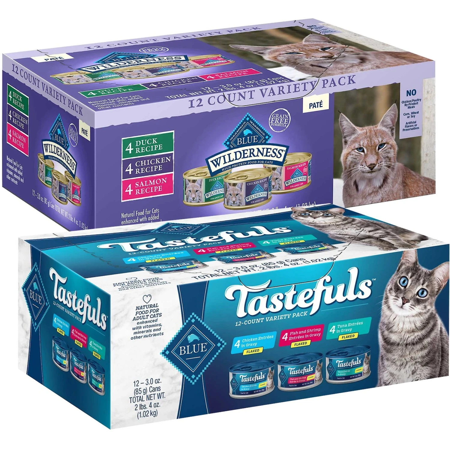 Blue Buffalo Tastefuls Tuna, Chicken, Fish & Shrimp Entrées Variety Pack Flaked Wet Cat Food & Blue Buffalo Wilderness Pate Variety Pack Duck, Chicken & Salmon Grain-Free Cat Canned Food