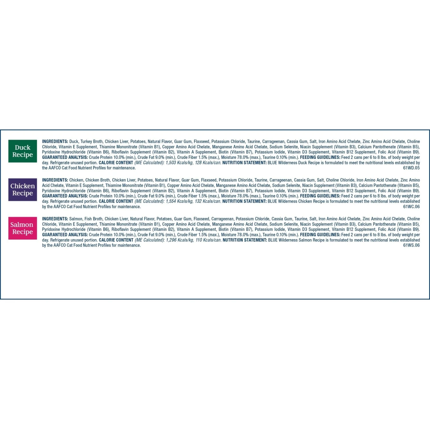 Blue Buffalo Wilderness Pate Variety Pack Duck, Chicken & Salmon Grain-Free Cat Canned Food, 3-oz, case of 12 — Prepare your pet pal for a feast of flavors with Blue Buffalo Wilderness High Protein Grain Free, Natural Adult Pate Wet Cat Food. Purr-fect for your adult fur-iend, this irresistibly tasty wet food is made using only the finest naturally grain and gluten-free ingredients. It starts with high-protein chicken, salmon or duck, packed with healthy fruits and veggies, then enhanced with vitamins and minerals. The exclusively wholesome ingredients do not contain any grain, gluten, by-product meals, corn, wheat, soy, artificial flavors or preservatives.