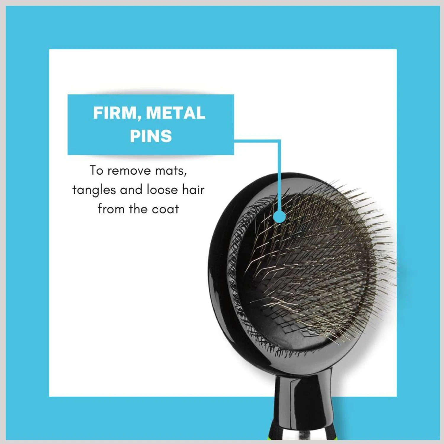 - Penetrates coat with firm pins to remove tangles and snarls, as well as reduce shedding.
