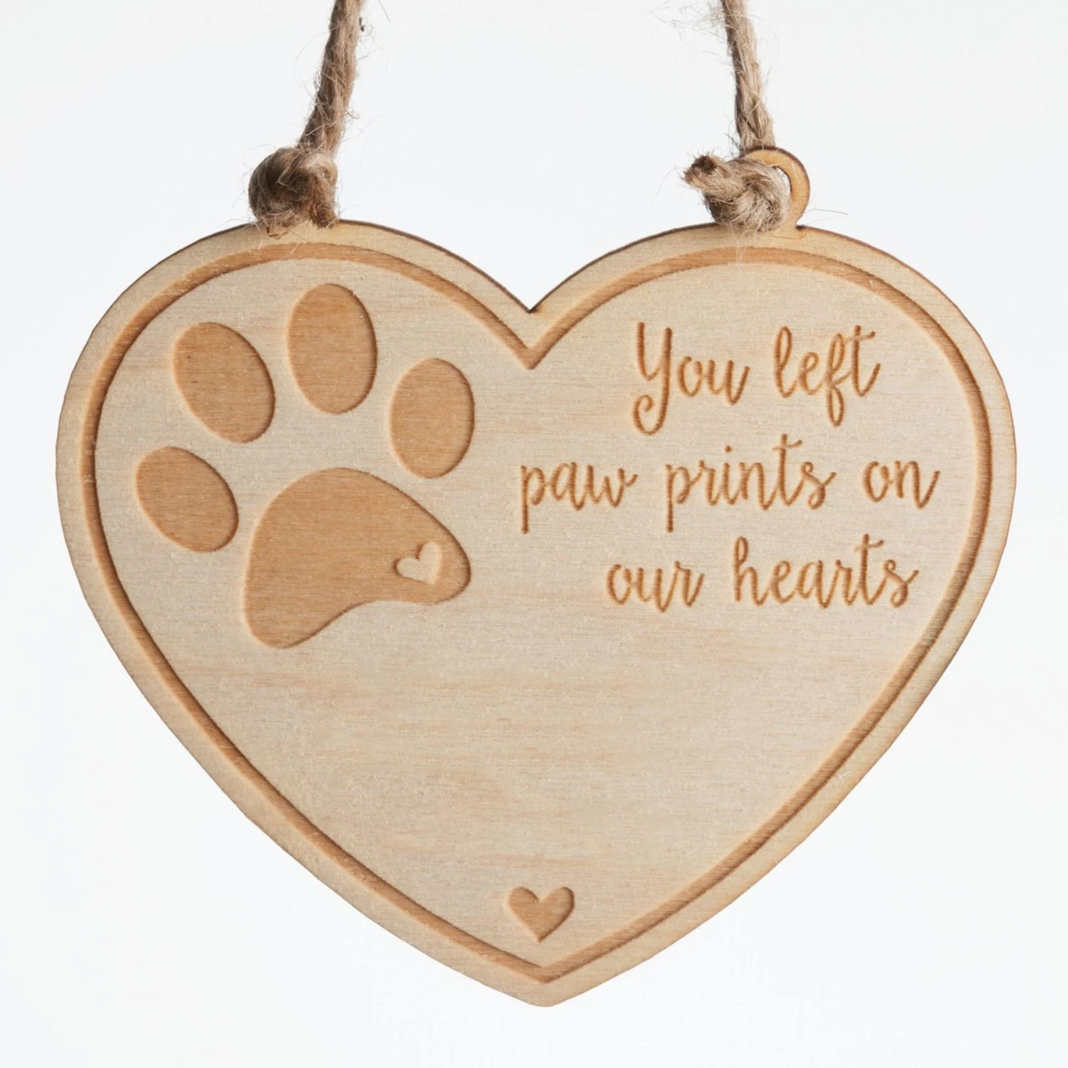 - Touching tribute ornament features the phrase “You left paw prints on our hearts”, your pet’s name and memorial dates.
