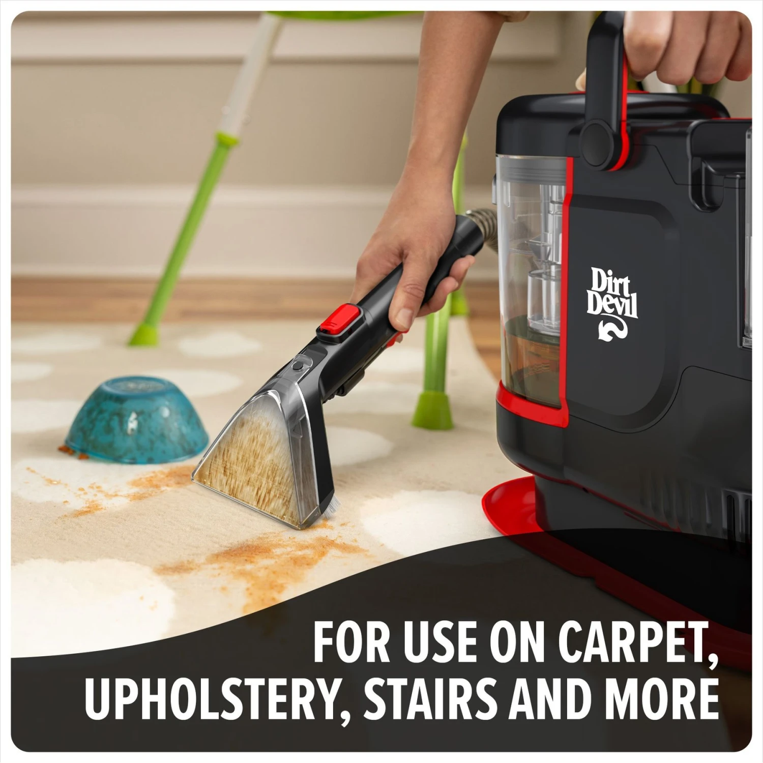 - Can be used on carpets, upholstery, car interiors, stairs and more.
