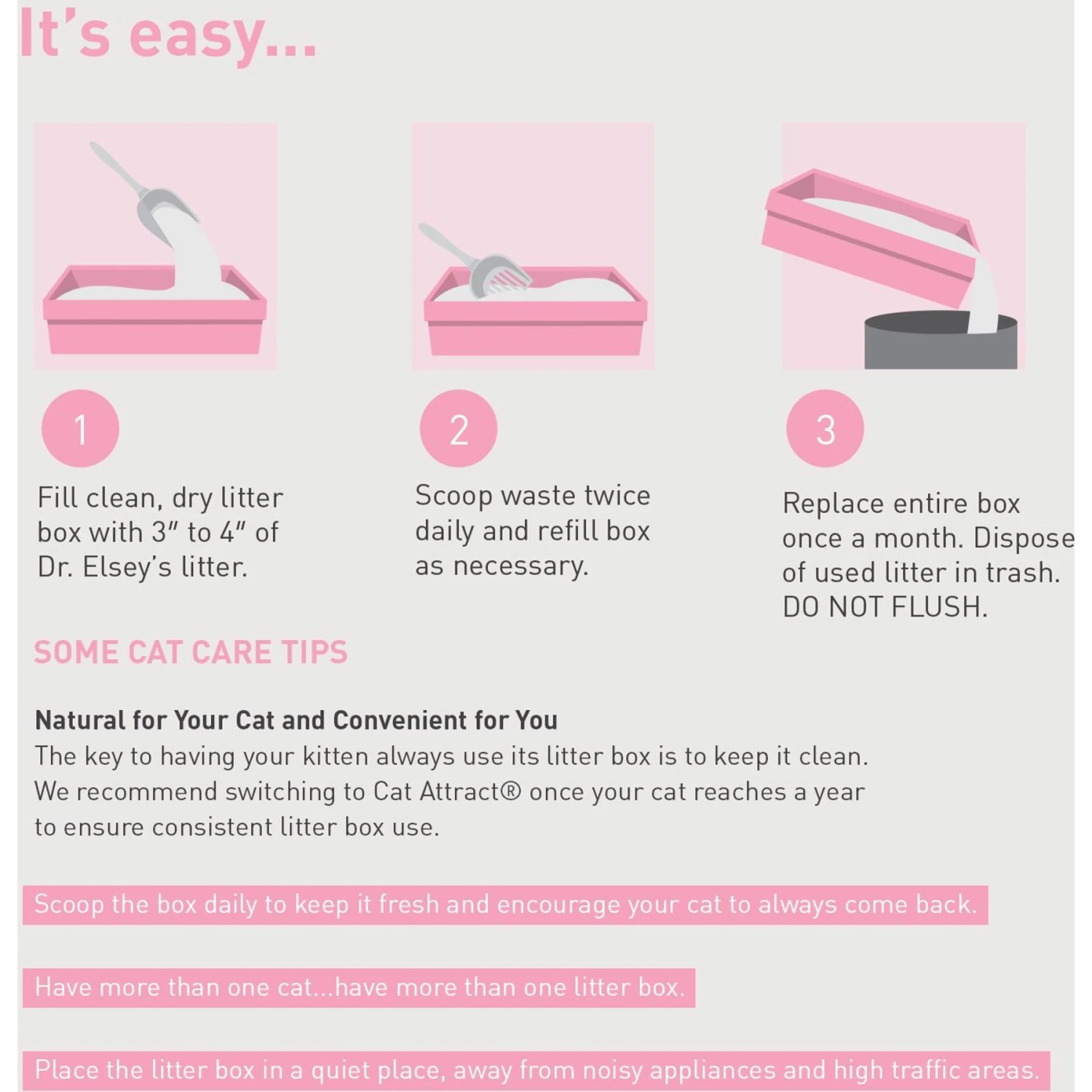Dr. Elsey’s Kitten Attract Clumping Clay Cat Litter is a purr-fect choice when training kittens to use the litter box (sold separately). A natural herbal attractant helps to draw kittens to the box, plus a kitten-specific granule size and smooth texture are easy on your kittenโs tender paws. The combination of herbs, texture, and particle size are all designed to capture your kittenโs interest and encourage litter box use. Small granules create hard clumps for easy scooping, too, and the formula also minimizes tracking to help keep your house clean.