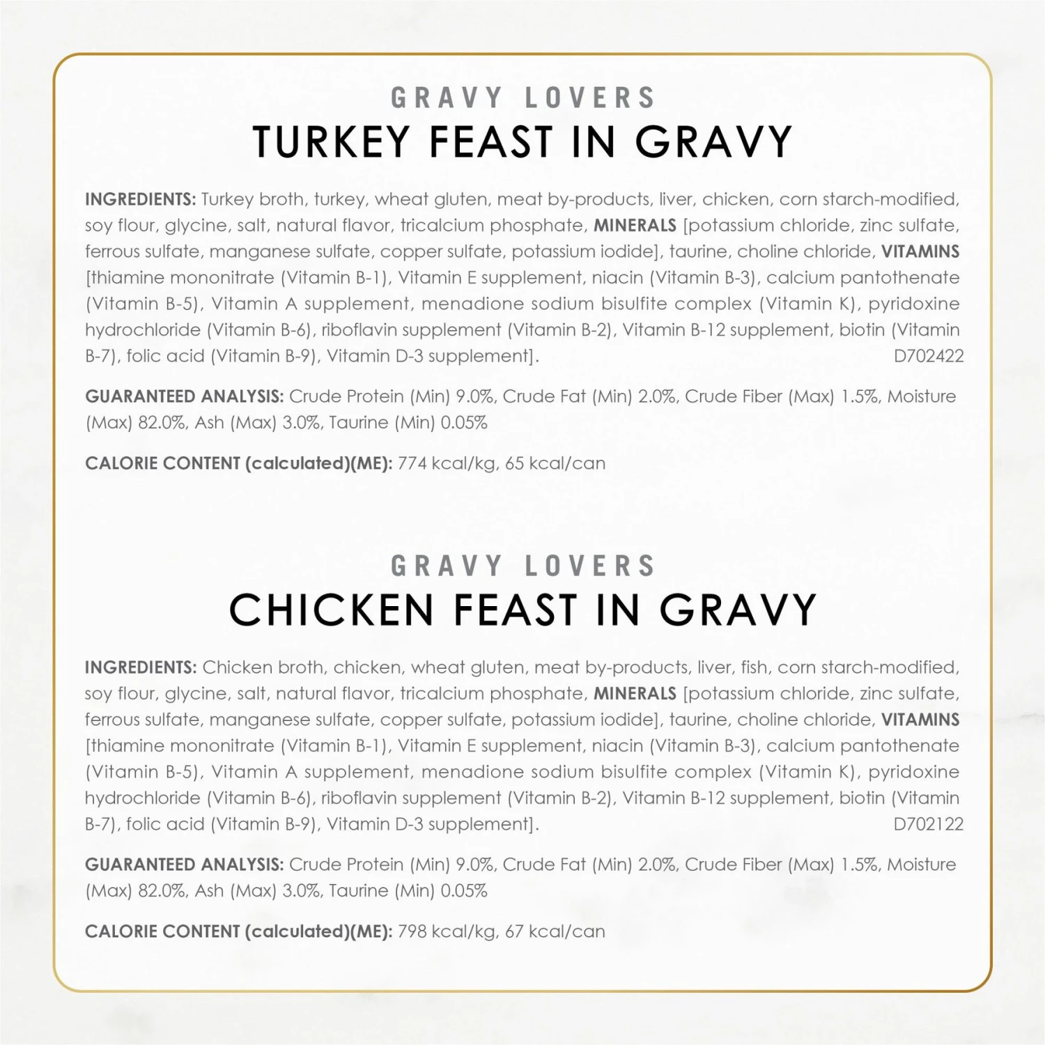 - This irresistible, protein-rich Gravy Lovers variety pack offers gourmet meals with enticing aromas in a light, savory cat food gravy.