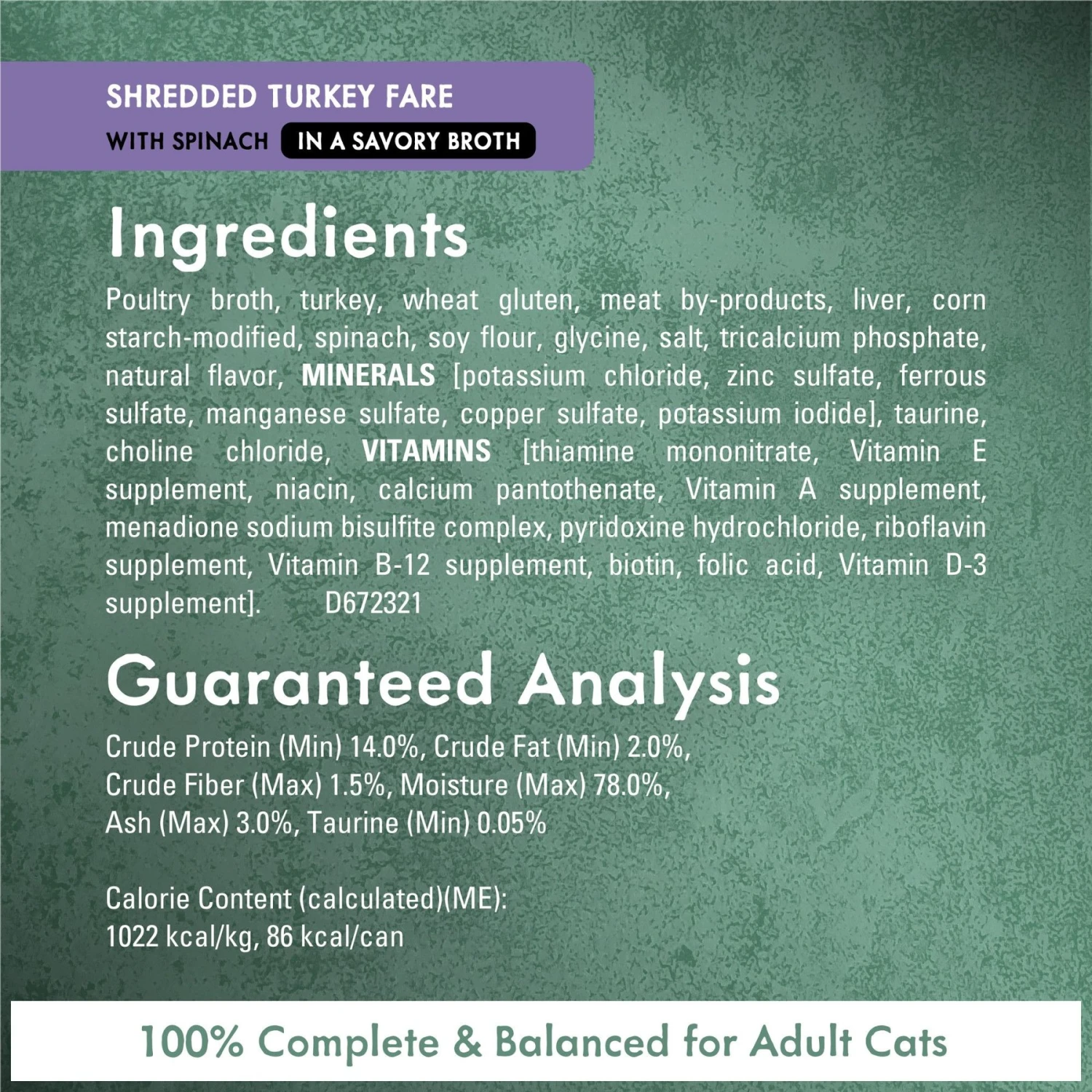 - Canned cat food shreds crafted with real, high-quality ingredients, featuring chicken, tuna or turkey with spinach in a Fancy Feast broth.