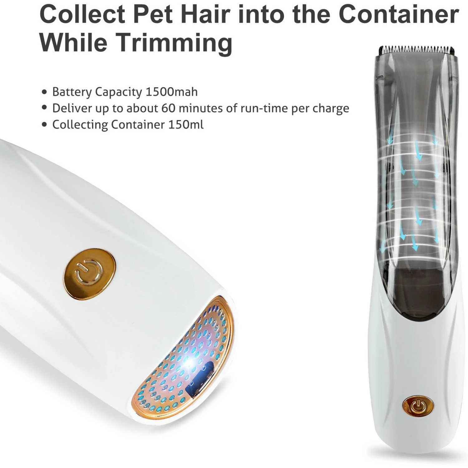 - Suction function collects pet hair into a container while you trim to keep your home clean.