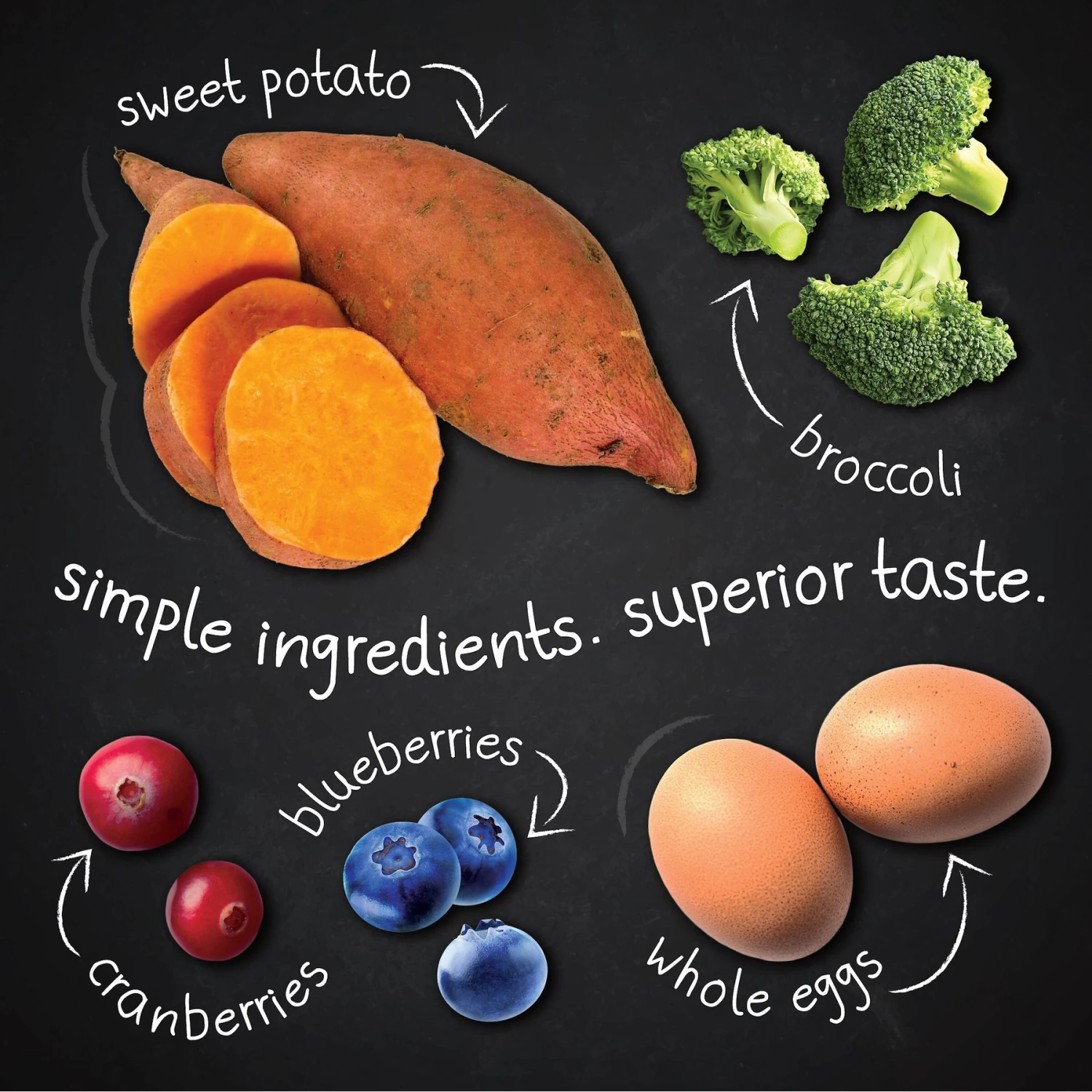 - Does not contain peas, lentils, chickpeas or white potatoes.