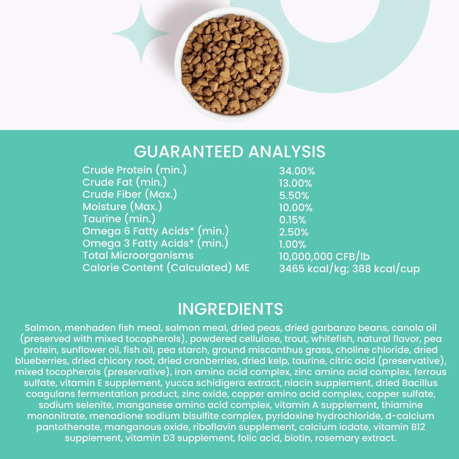 - Packed with 34% protein, boosts your furry friend’s energy and maintains lean muscle mass.