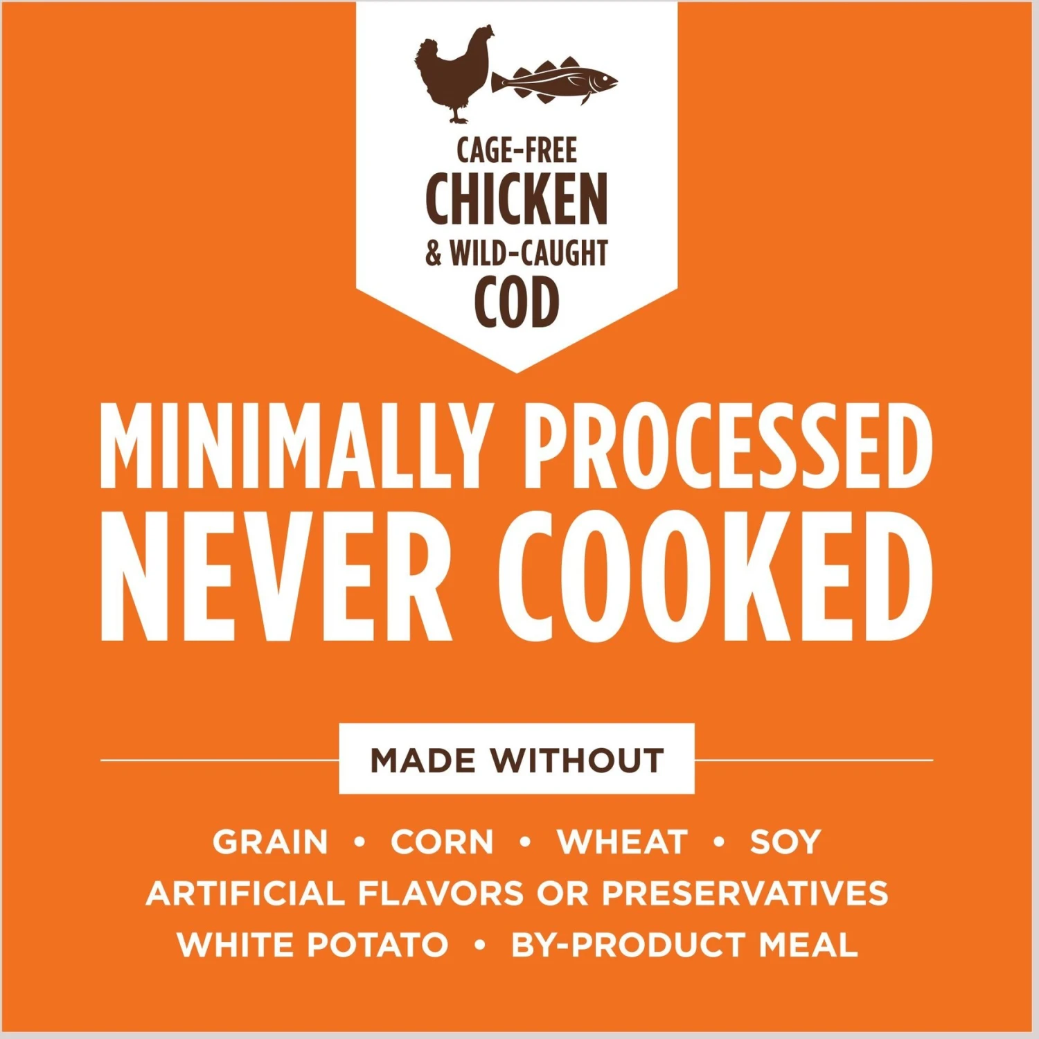 - Crafted with real cage-free chicken first, followed by other whole-food ingredients like wild-caught cod, salmon oil, cranberries and chia seeds.