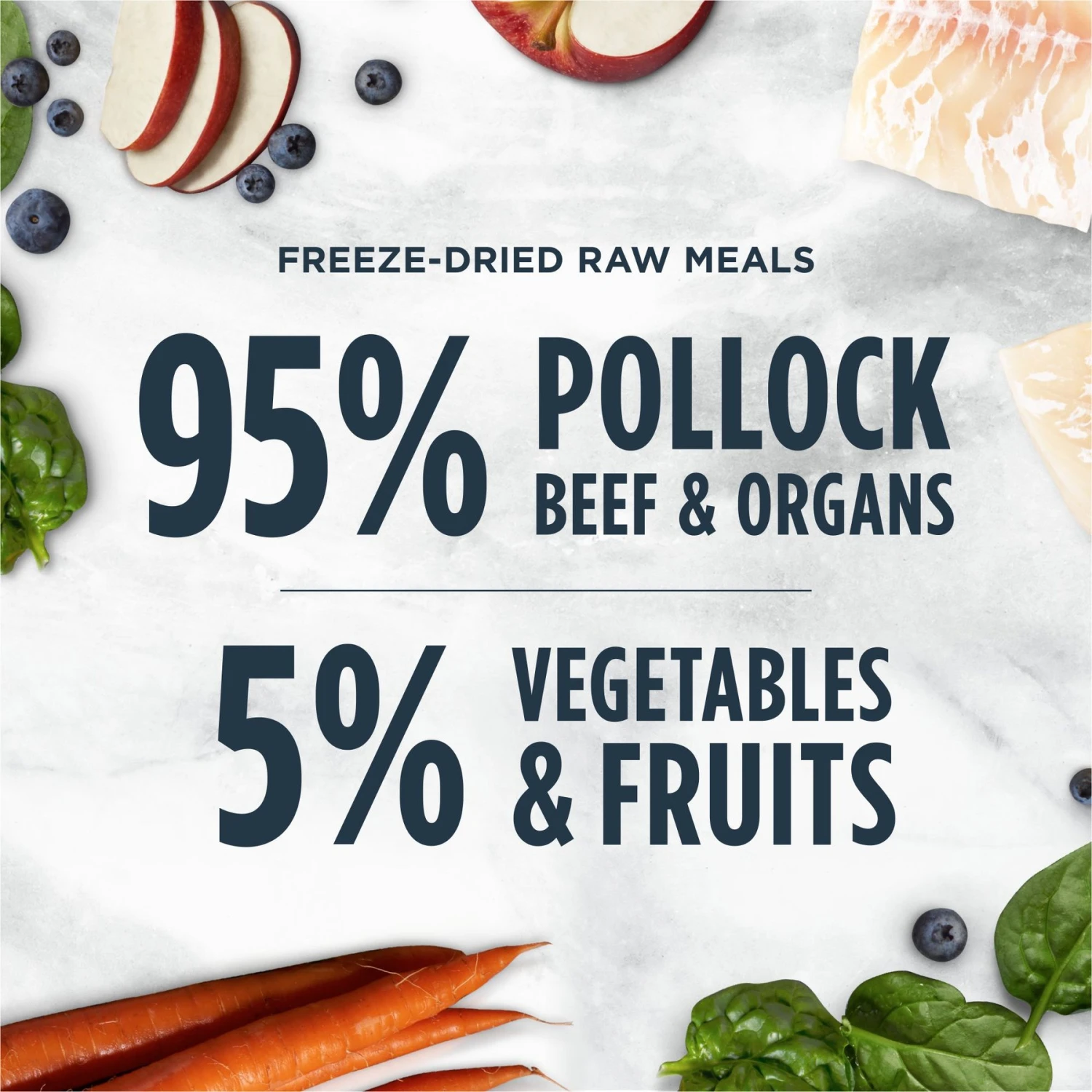 - Features freeze-dried Wild-Caught Alaskan Pollock for a total of 95% fish, meat and organs.