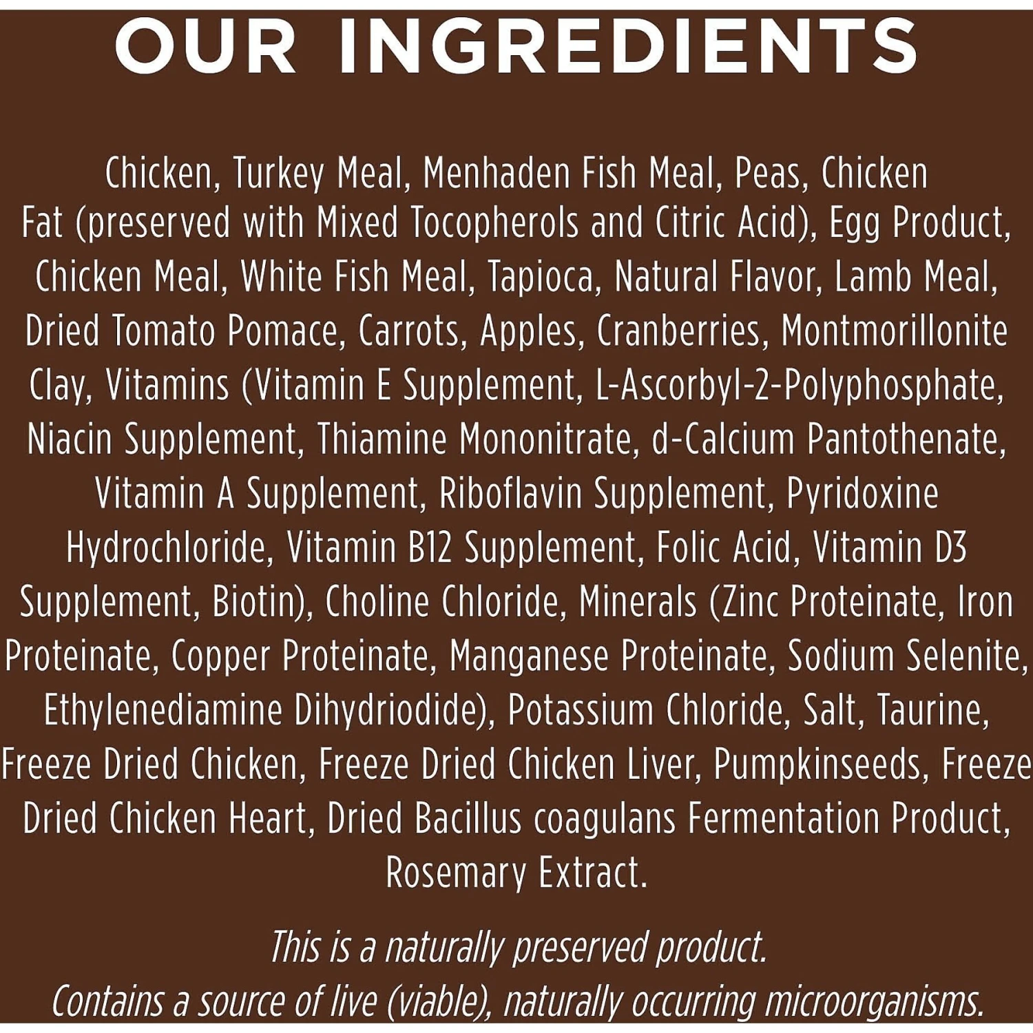 - Includes 81% real animal ingredients and nutritious oils plus 19% vegetables, fruits and other wholesome ingredients.