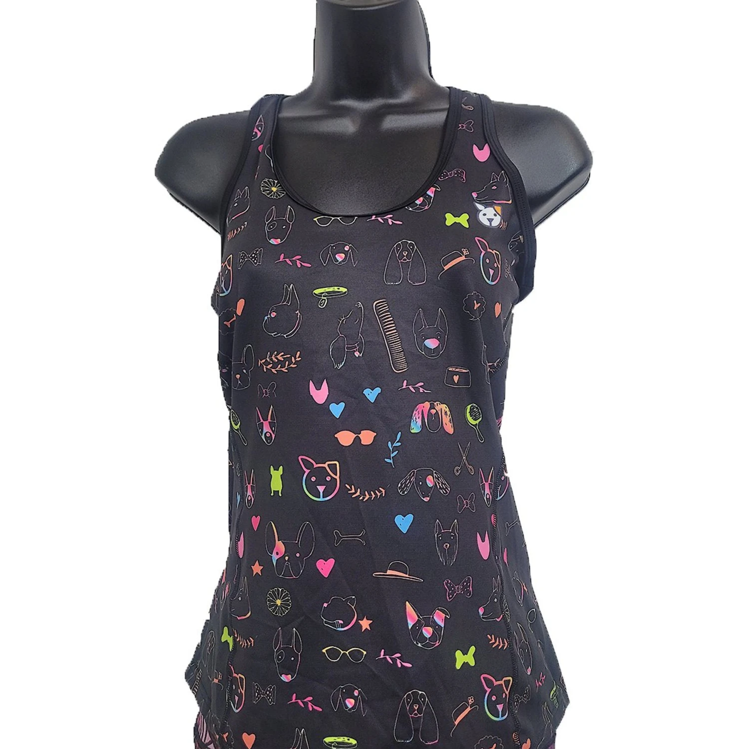 - Trendy tank top features a rainbow of assorted pups, grooming tools and accessories.