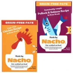 Made by Nacho Sustainably-Caught Pollock & Salmon Recipe in Bone Broth Pate Wet Cat Food, 6.4-oz tetra, case of 12โThe premium ingredients in the Made by Nacho Sustainably-Caught Pollock & Salmon Recipe in Bone Broth Pate Wet Cat Food are su-purr tasty and healthy for your furbaby. This grain-free pate recipe features pollock and salmon as its first ingredient. Rich, hydrating bone broth makes for a smooth and purr-fectly satisfying texture your best friend can sink his teeth into. Thereโs no corn, soy, wheat, grain or other bad stuff like artificial colors, flavors or preservatives. Best of all, this food is easy to serve up. Just squeeze and tear, fold and pop the food into the fridge to save it and recycle it when youโre done.