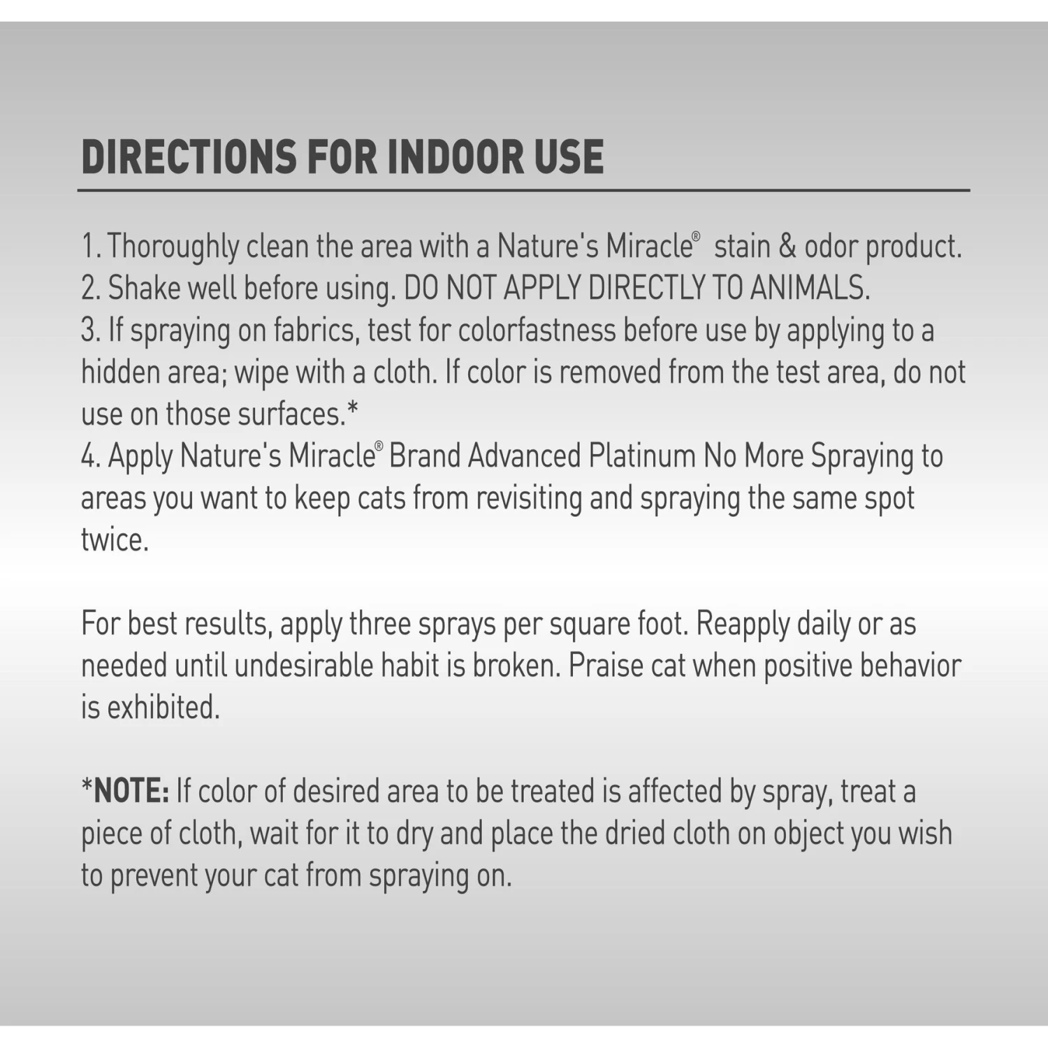 Keep your home fur-esh, clean, and free from unwanted stains and smells with the Natureโs Miracle Advanced Platinum No More Spraying formula! This effective repellent is made with essential oils to deter cats from spraying. To use, apply three sprays per square foot to the affected area. Repeat as needed until the habit is broken. This product is intended for use on furniture, floors, or other areas where your pet may be marking their territory, not directly on your purring pal!