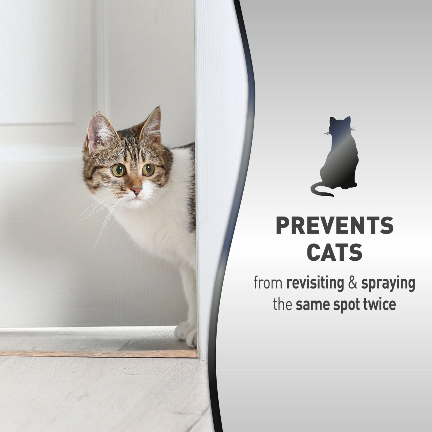 To Prevent Repetitive Spraying: Thoroughly soak previously stained area with Natureโs Miracle Just for Cats No More Spraying Stain and Odor Remover. Wait five minutes, then pat area with a cloth. For areas that have been repeatedly marked, a second application may be needed.