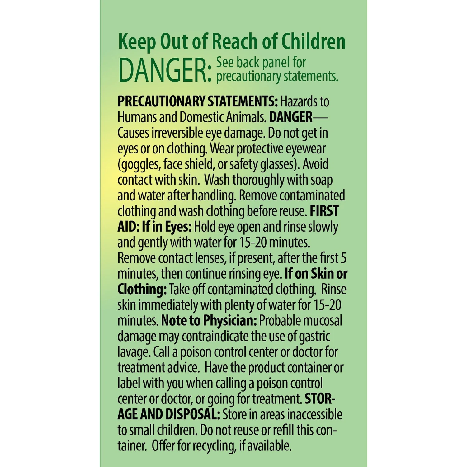 Causes irreversible eye damage. Avoid contact with eyes, skin or clothing. Wear protective eye wear (goggles, face shield, or safety glasses). Wash thoroughly with soap and water after handling.FIRST AID: Eyes: If splashed in eyes, flush with water for 15 minutes. If irritation persists, seek medical attention. Skin: Wash with plenty of soap and water. Ingestion: Do not induce vomiting. Drink large quantities of milk or water. Obtain medical attention or contact a poison control center immediately. Take container, label or product name and DIN Number with you when seeking medical attention. Disposal: Do not reuse empty container. Rinse container and offer for recycling. If recycling is not available, discard in trash. KEEP OUT OF REACH OF CHILDREN.