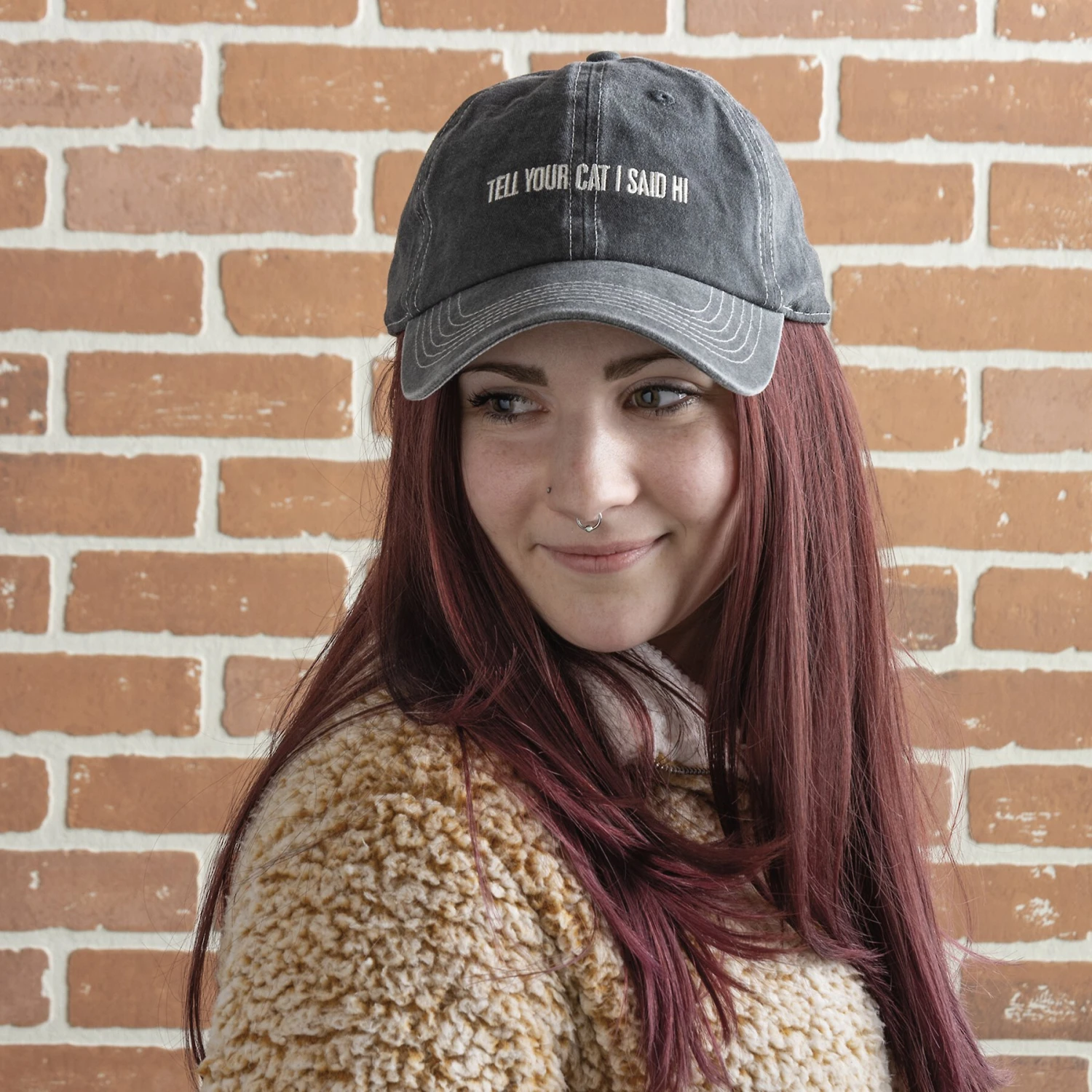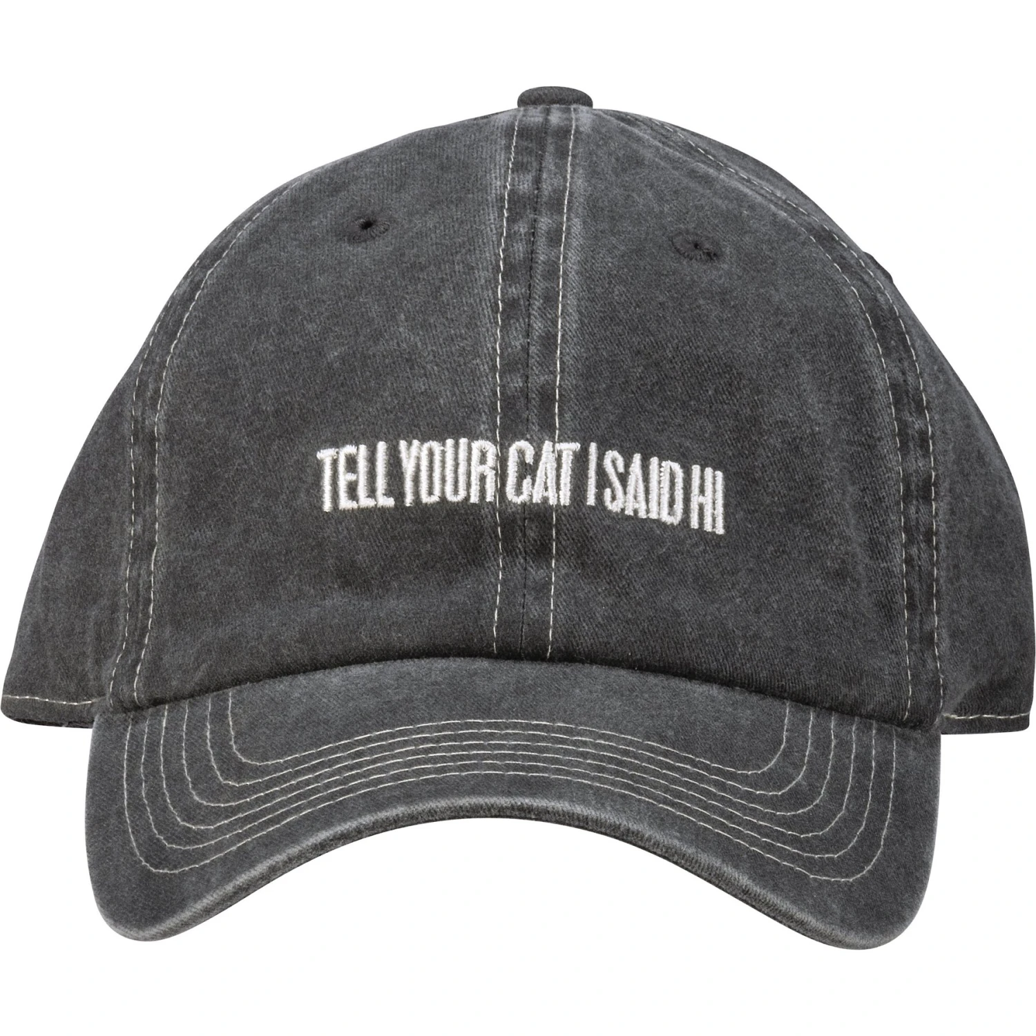 - Features an embroidered message that reads Tell Your Cat I Said Hi”.”