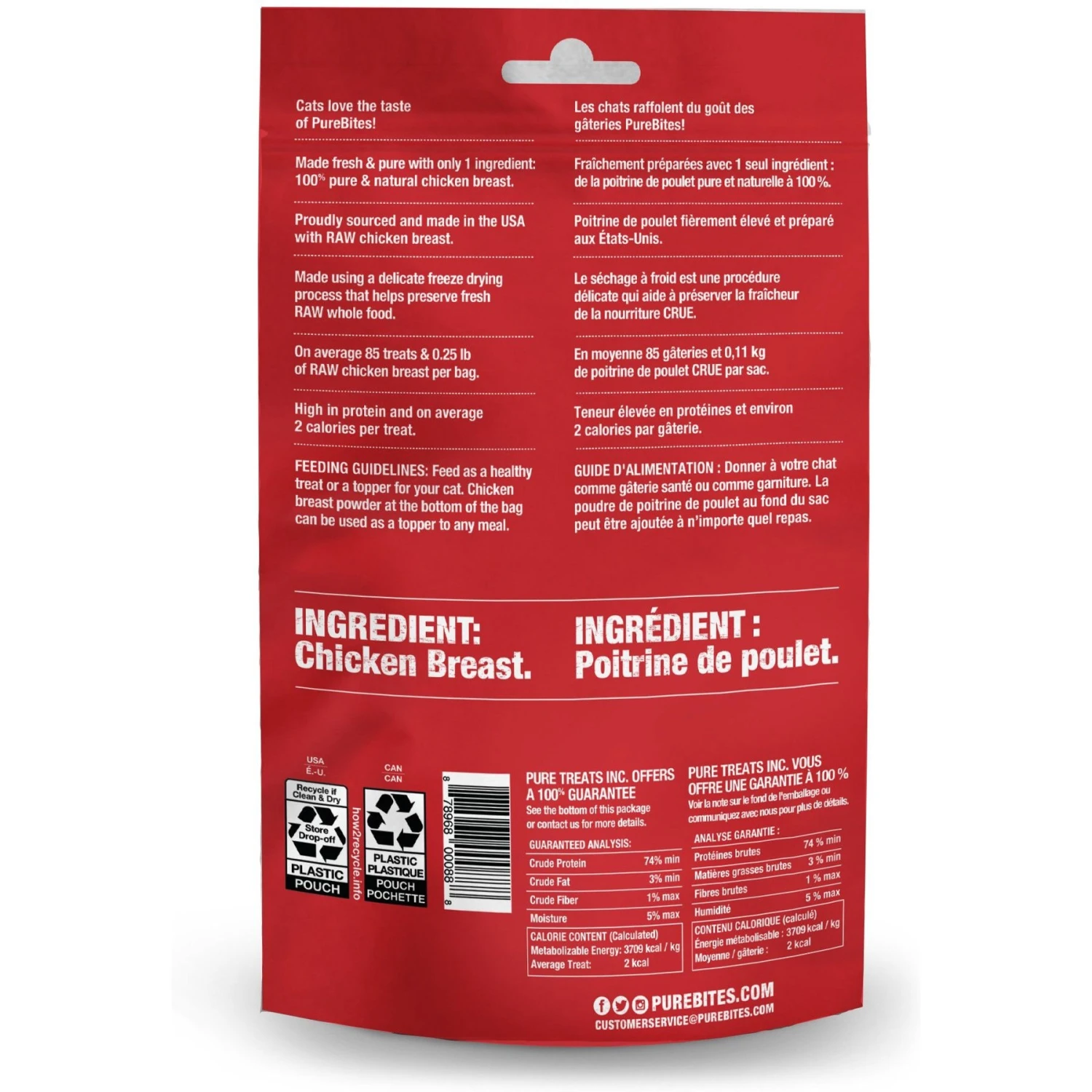 Itโs trueโPureBites Chicken Breast Freeze-Dried Raw Cat Treats are made with just one ingredient, so you know exactly what youโre feeding your furbaby. Pure, human grade chicken breast is freeze dried, locking in paw-some aroma, texture and freshness. Freeze drying removes only water, preserving the natural nutrition of this fresh chicken. These tasty treats are also free of any added preservatives and other bad stuff. Because theyโre so pure, theyโre easy to digest. These treats are paw-fect for kitties with health issues, who have allergies or who are on restricted diets. The treats average just two calories each, so theyโre also a great option for kitties who need to lose a little weight. Rich in protein, these treats support a happy, healthy life with whisker-licking goodness.