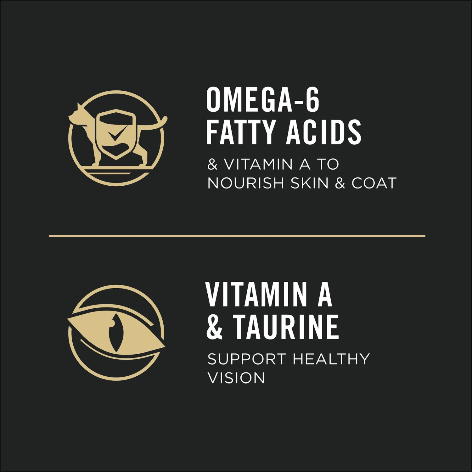 - Vitamin A and taurine help support your feline friend’s keen vision, while omega-6 fatty acids and vitamin A nourish her skin and soft coat.