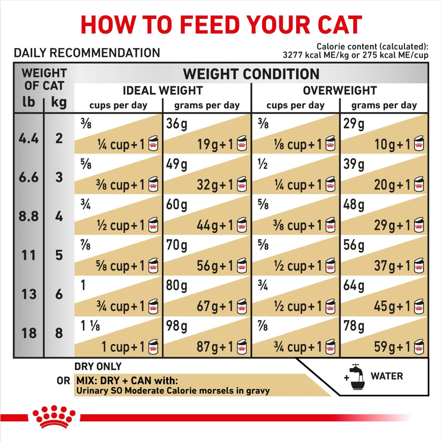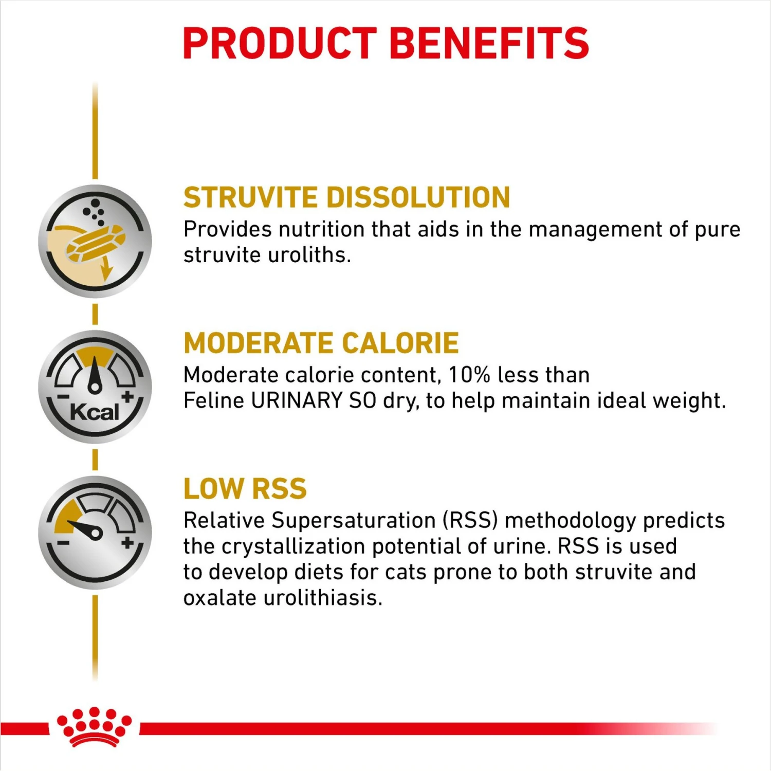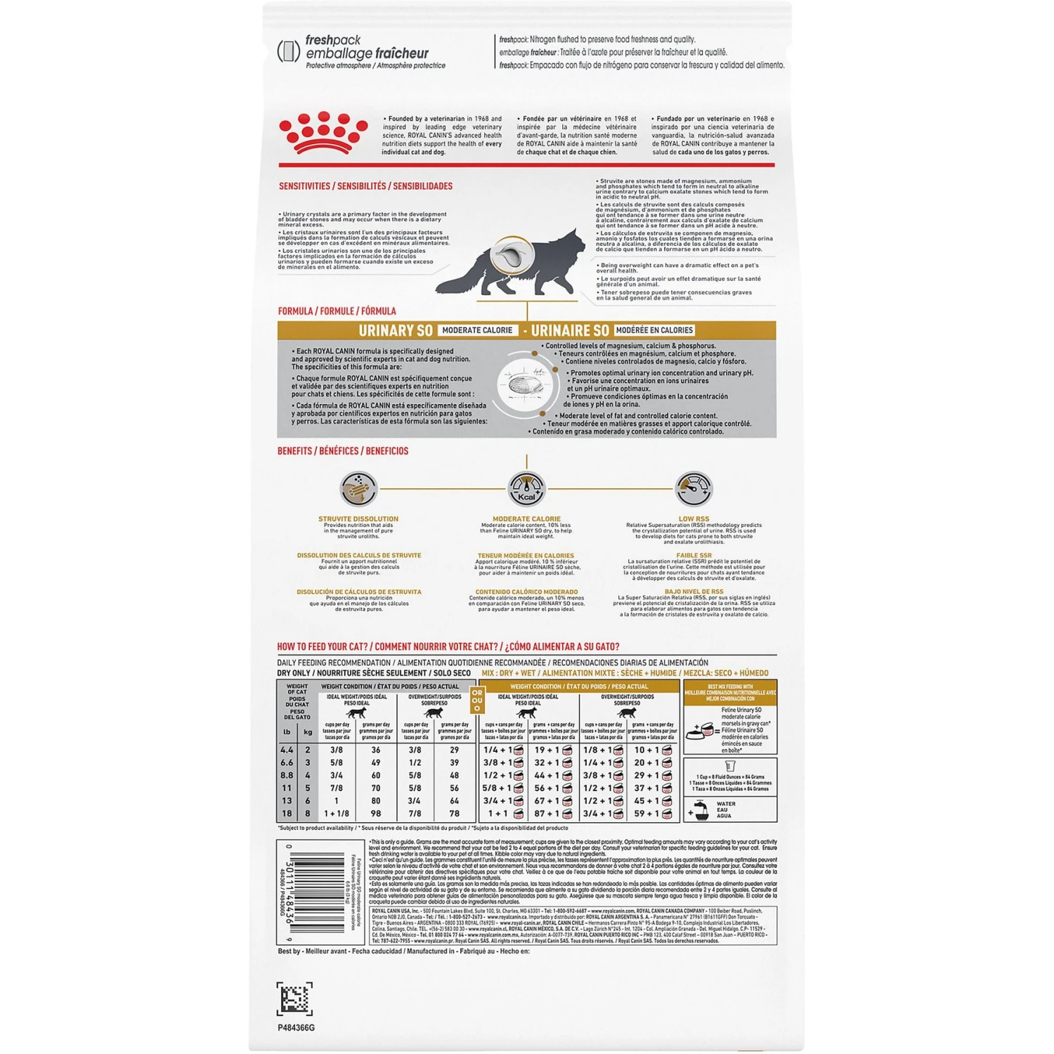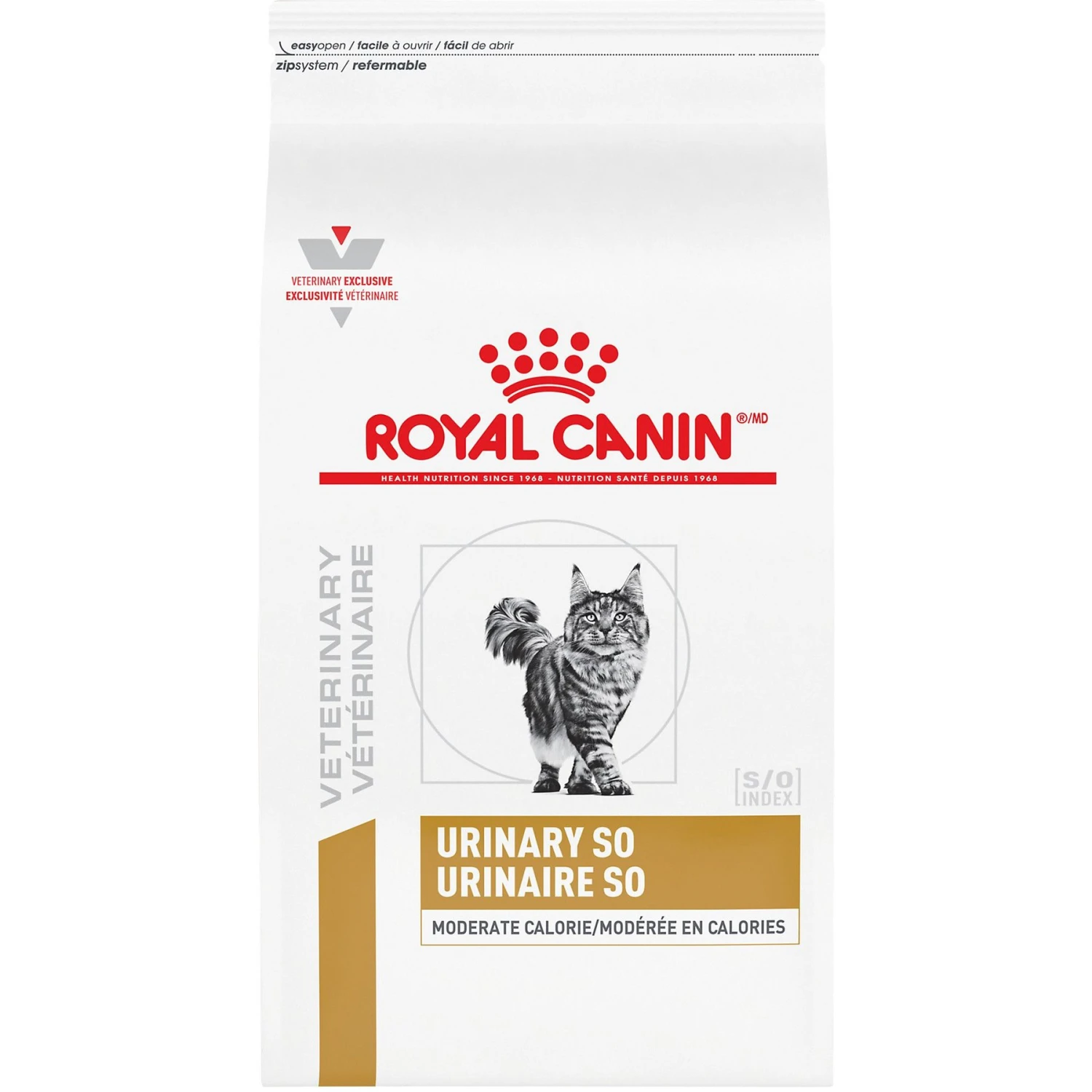 - Royal Canin Urinary SO Moderate Calorie is a veterinary-exclusive dry cat food for cats prone to weight gain with urinary health concerns.