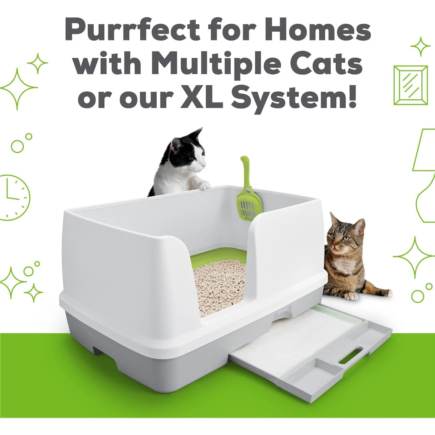 - Comes with one 8-count bag of multi-cat pads and a 7-lb. bag of non-clumping cat litter pellets.