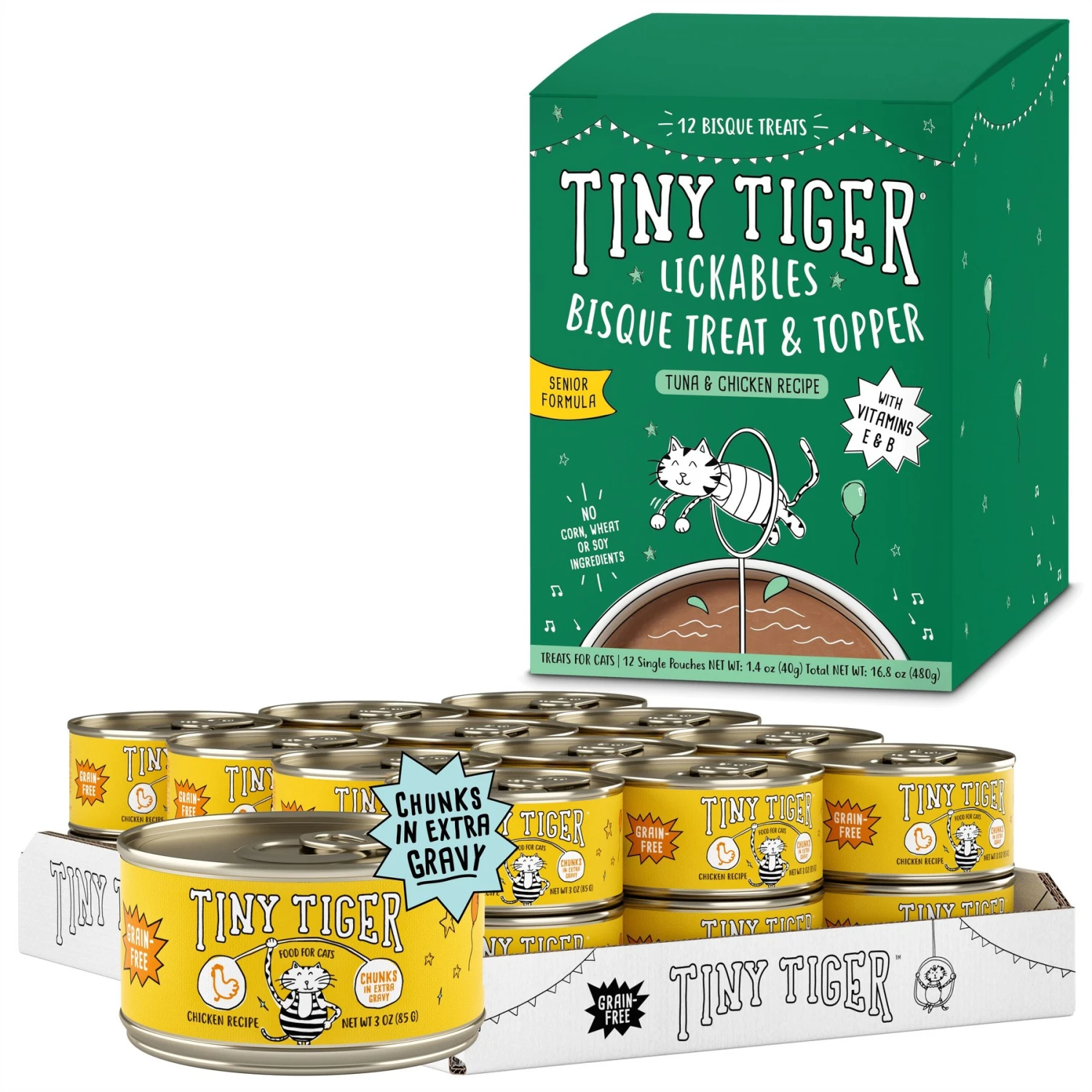 Tiny Tiger Chunks In EXTRA Gravy Chicken Recipe Grain-Free Canned Cat Food & Tiny Tiger Lickables, Senior Formula, Tuna & Chicken Recipe, Bisque Cat Treat & Topper