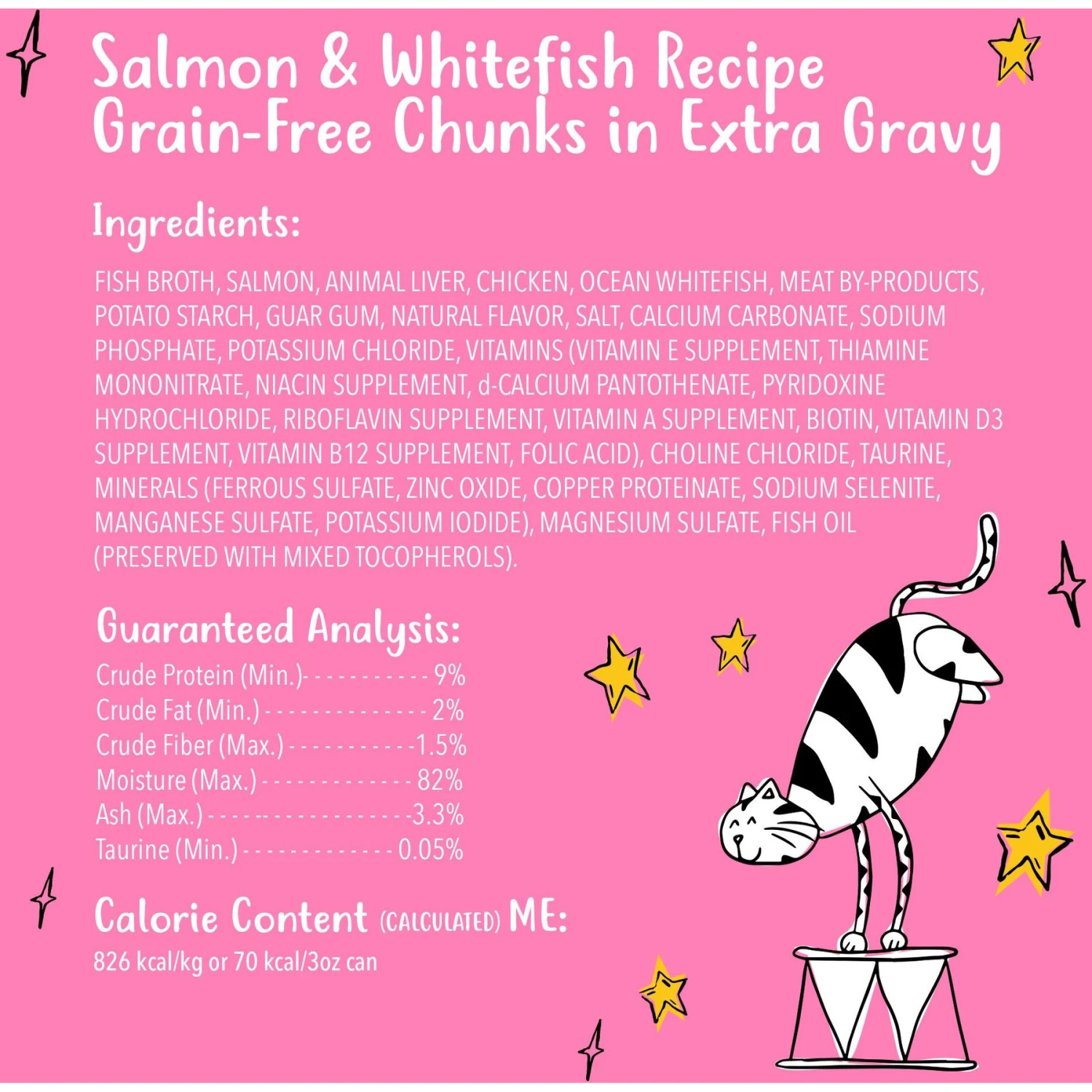 - Grain-free recipe with chunks of real salmon and whitefish as the top ingredients for the protein and flavor cats crave.