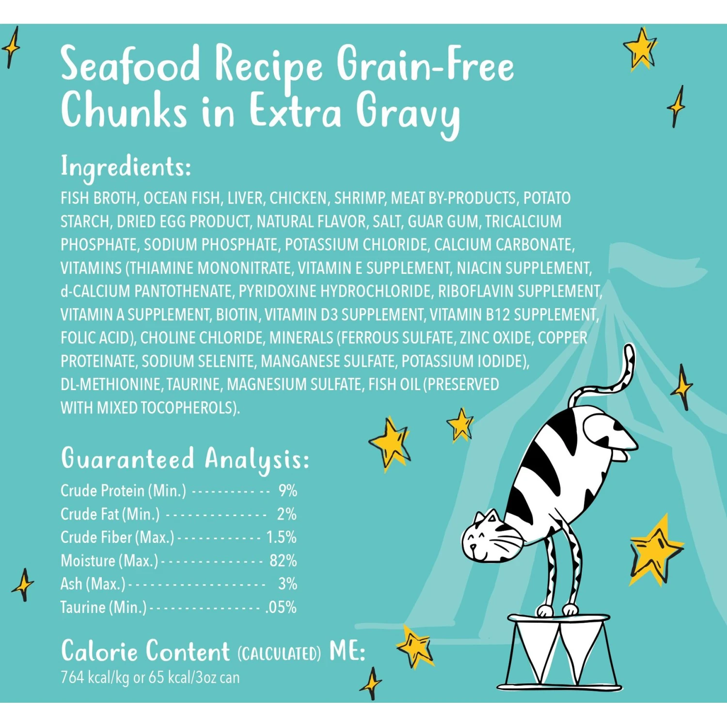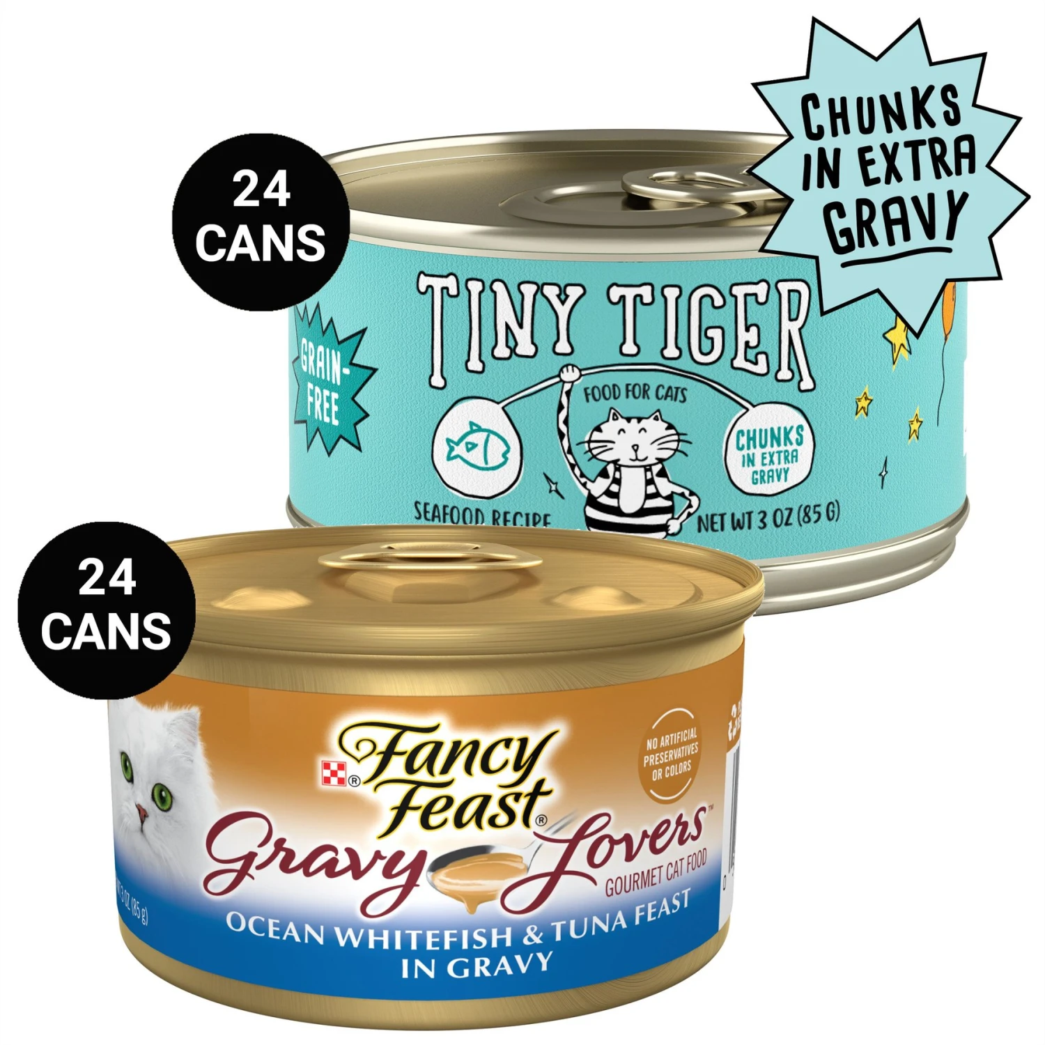 Tiny Tiger Chunks In EXTRA Gravy Seafood Recipe Grain-Free Canned Cat Food & Fancy Feast Gravy Lovers Ocean Whitefish & Tuna Feast In Sauteed Seafood Flavor Gravy Canned Cat Food