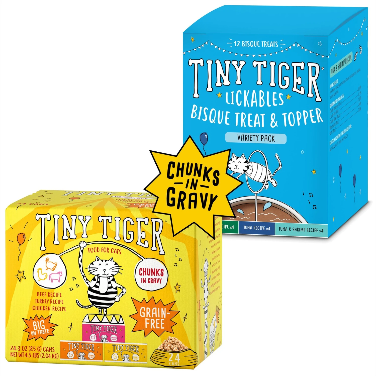 Tiny Tiger Chunks In Gravy Beef & Poultry Recipes Variety Pack Grain-Free Canned Cat Food & Tiny Tiger, Lickables, Variety Pack, Bisque Cat Treat & Topper