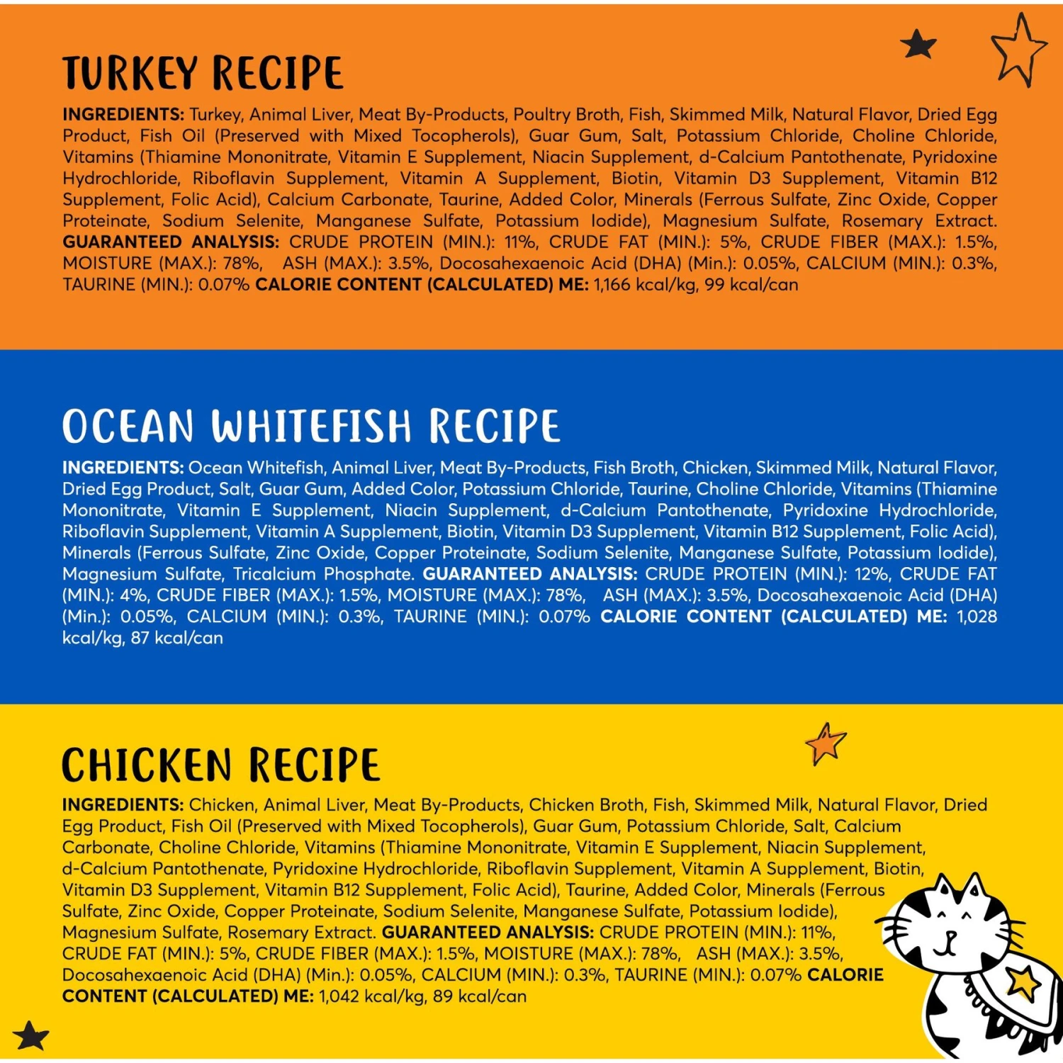 - Comes with a variety of feline favorites—tuna and chicken, tuna and shrimp, and tuna recipes.