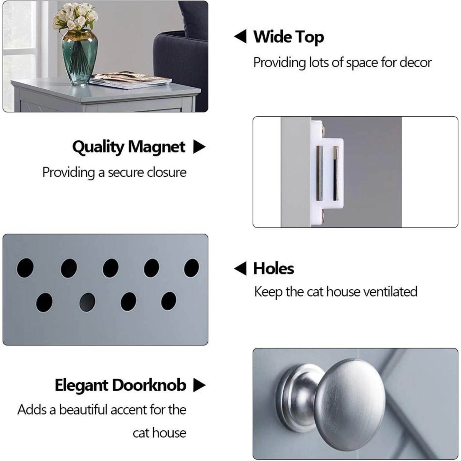- Wide top can hold potted plants, lamps and more—ventilation holes keep the interior comfy for your kitty.