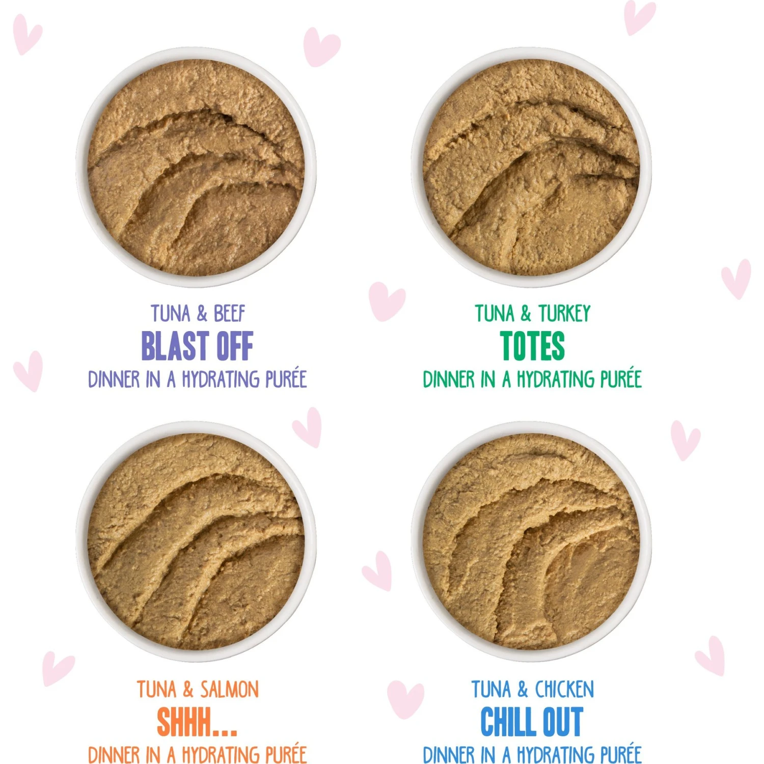 - Includes 3 packs each of Tuna & Chicken Chill Out, Tuna & Salmon Shhh…, Tuna & Beef Blast Off! and Tuna & Turkey Totes!—each recipe pureed into a mouth-watering, indulgent pate.