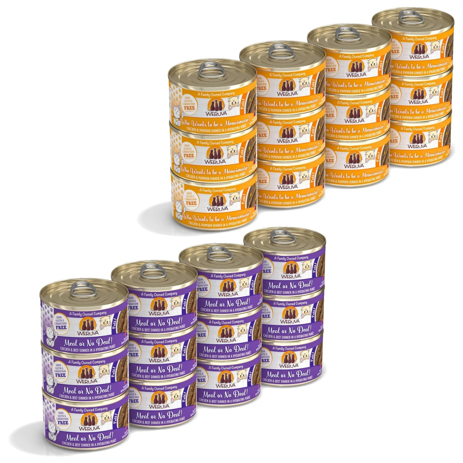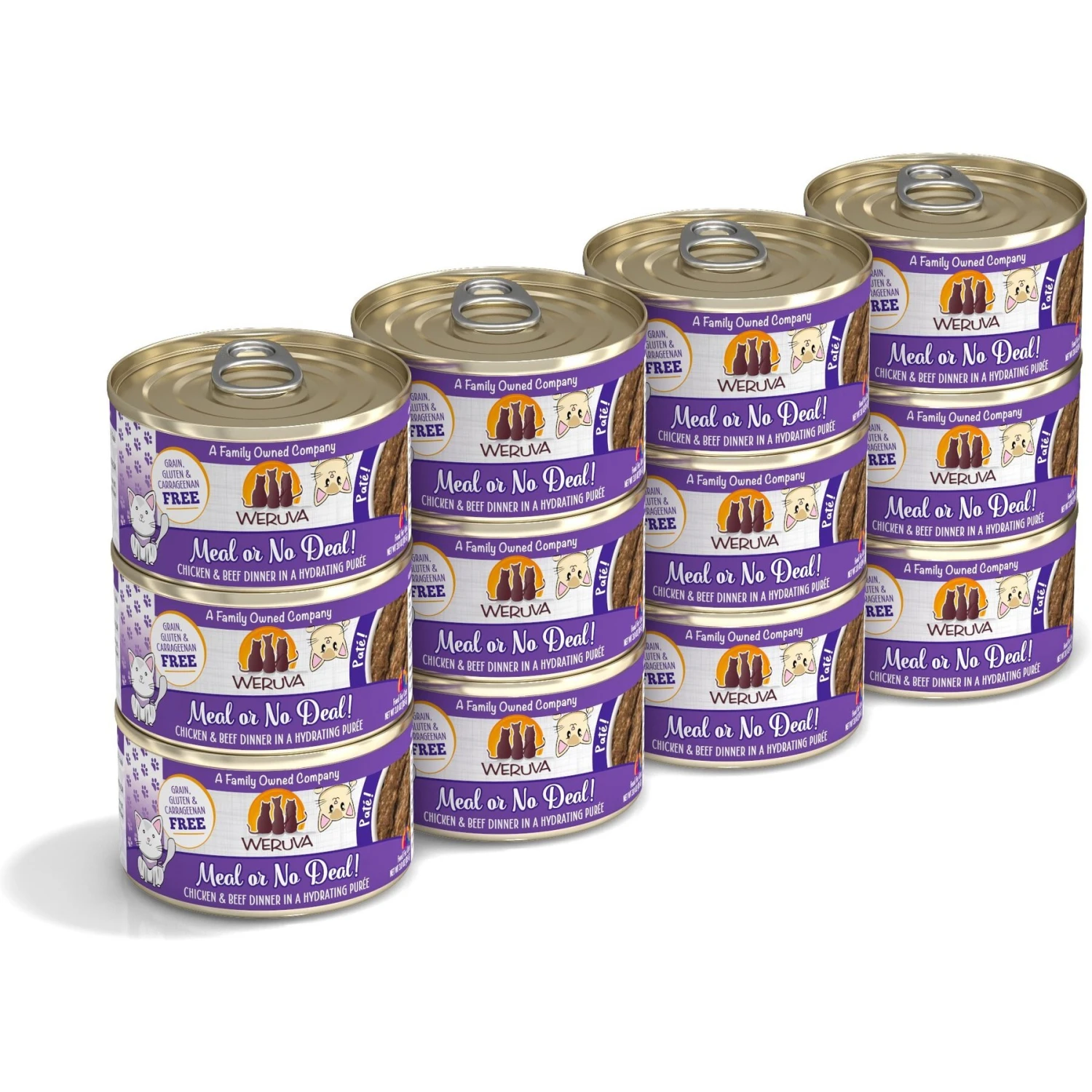 Weruva Classic Cat Meal or No Deal Chicken & Beef Pate Canned Cat Food, 3-oz can, case of 12—The grand prize is locked inside Weruva Classic Cat Meal or No Deal Chicken & Beef Pate Wet Canned Cat Food: a medley of chicken and beef pureed into a paw-fect, silky pate that’s sure to have her licking her bowl clean. You’ll feel good about how you’re nourishing her with the simple wholesome ingredients that you can actually see in the food! Not only is it grain-free, but it’s also made without those not-so-desirable ingredients like gluten, carrageenan and artificial flavors and colors. It will leave your furbaby feline good with the high moisture content that meets her needs. Plus, there are a variety of flavor options with Weruva so you can help kitty find her fur-avorite.